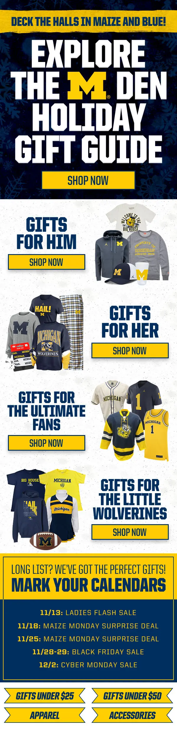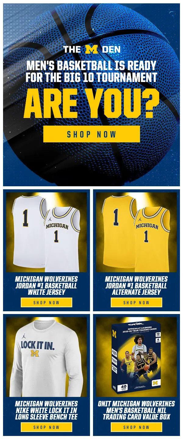 This work was designed for Michigan Athletics through my employer Legends Global. I produced digital marketing and web deliverables including promotional graphics, email campaigns, and site assets. Each piece was designed to maintain brand consistency while supporting merchandise promotions and engaging fans across Michigan’s digital platforms.