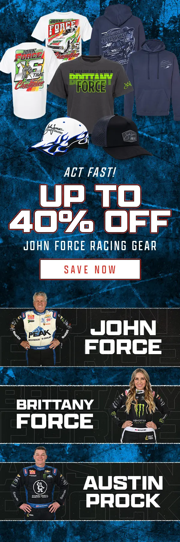 These projects were developed for the National Hot Rod Association (NHRA) during my time at Legends Global. The work includes digital marketing and web design such as promotional graphics, email campaigns, and supporting site assets. Each design was created to reinforce the NHRA brand while promoting merchandise and engaging fans across its online platforms.